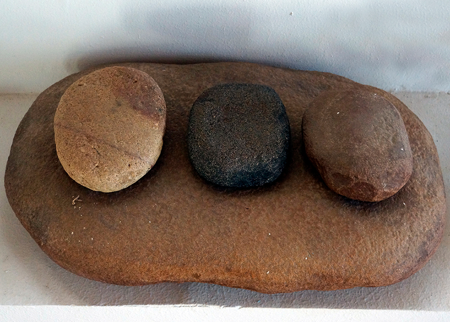 Ein typischer Reibestein mit drei verschiedenen Handläufern zum Mahlen von Getreide und Grassamen.